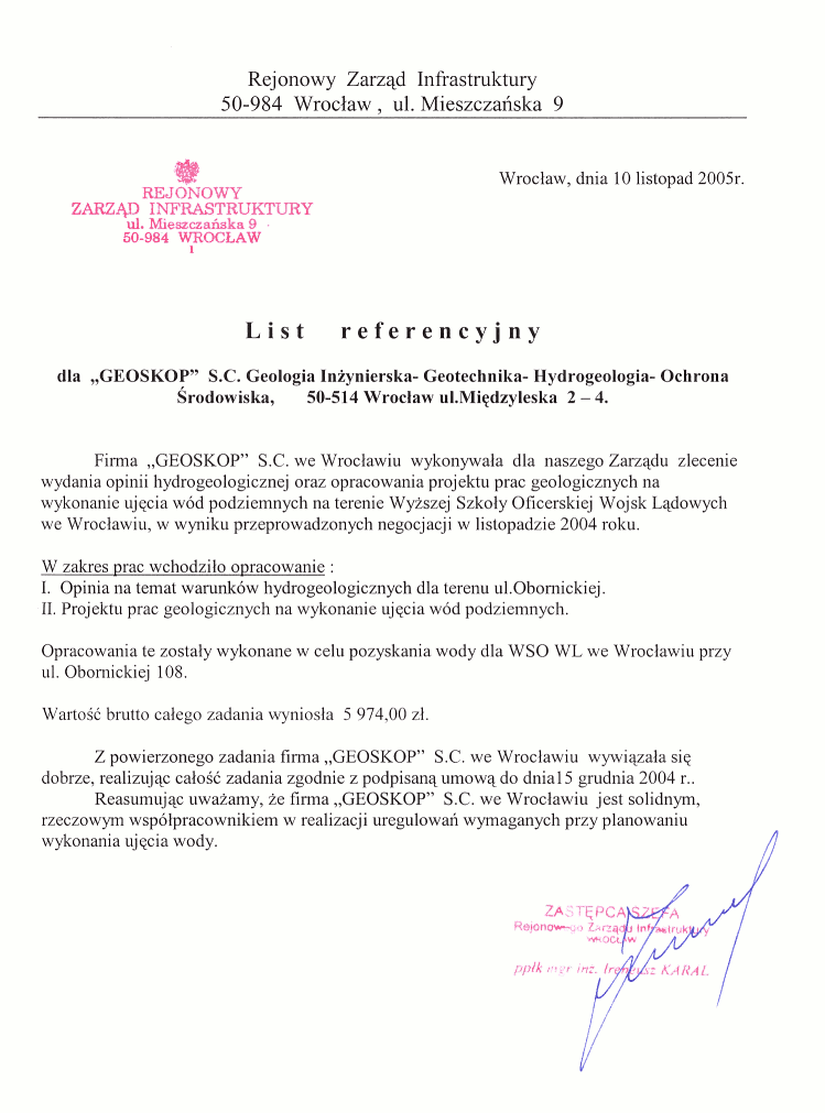 - Projekt prac geologicznych na wykonanie ujęcia wód podziemnych na terenie Wyższej Szkoły Oficerskiej Wojsk Lądowych we Wrocławiu.